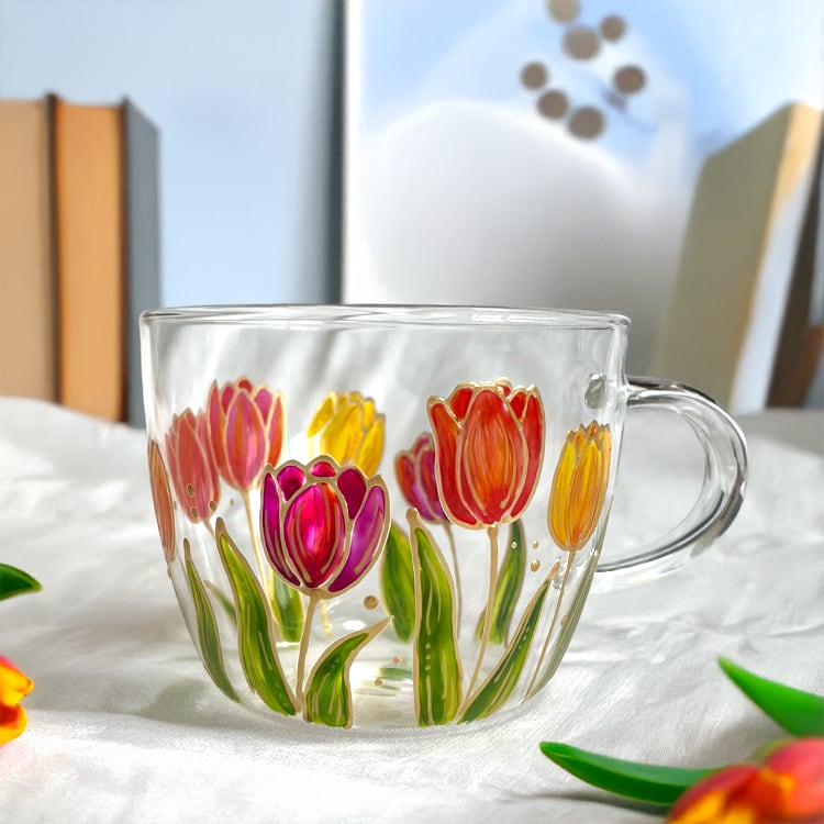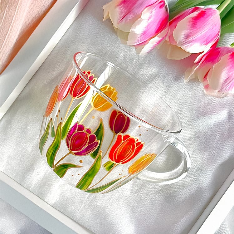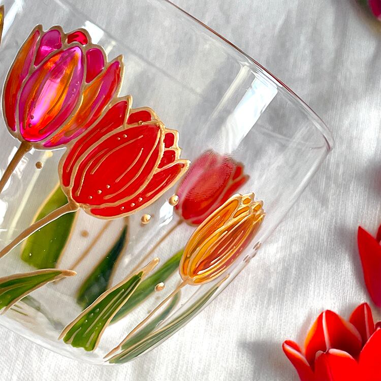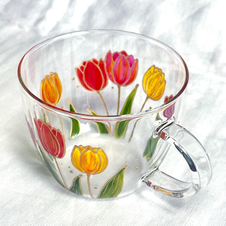 チューリップの耐熱ガラスマグ|春の花マグカップ|ギフト|名入れ対応