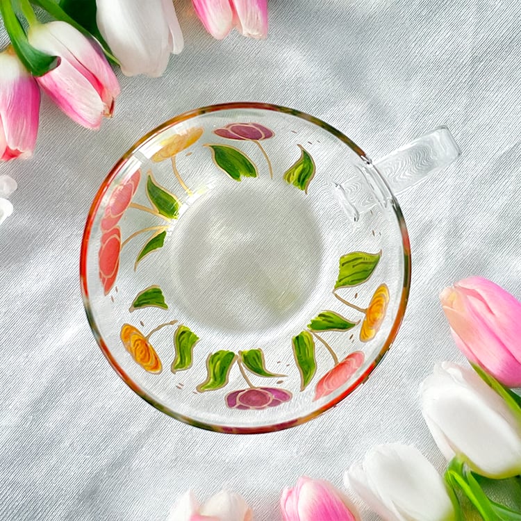飲み物を入れるとガラスの透明感と花の色がやさしく広がります。