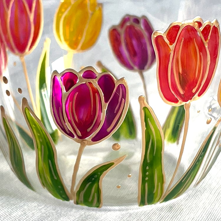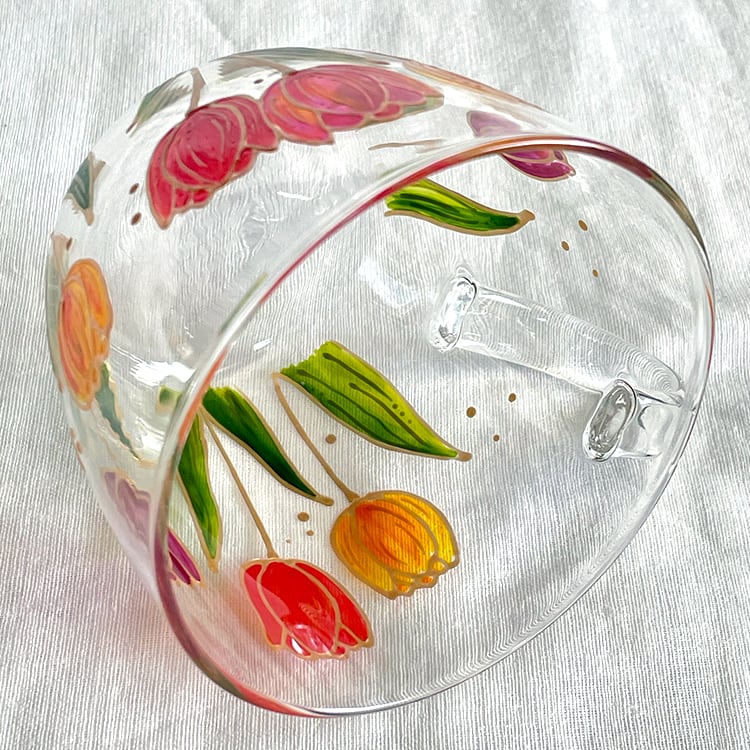 透明な耐熱ガラスに、カラフルなチューリップを
